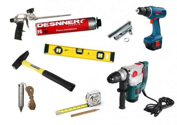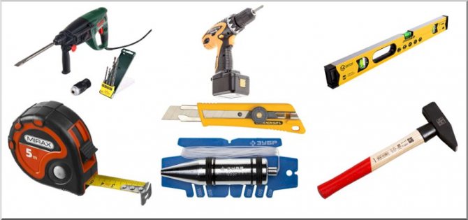 Maintenant, nous préparons quelques cales, non loin de nous, nous mettons un niveau de rack jusqu'à un demi-mètre de long, les fixations nécessaires, un marteau et un perforateur connectés au réseau avec une perceuse à portée de main.