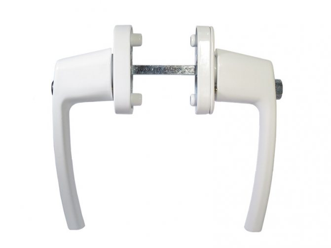 - Poignées double face pour portes de balcon. Dans ce cas, des poignées sont présentes des deux côtés de la porte et sont reliées par une tige métallique. Dans ce cas, il sera très pratique d'ouvrir la porte du balcon à la fois de l'extérieur et de l'intérieur.
