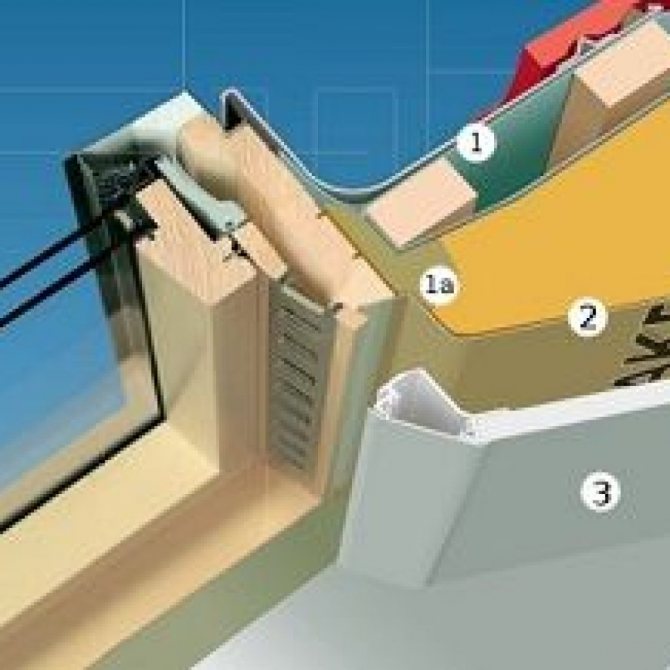 - De l'extérieur, vous devez imperméabiliser le châssis du grenier. Pour ce faire, une partie du lattage est retirée du haut de l'ouverture afin de fixer la gouttière de drainage à cet endroit. L'étanchéité du toit doit être installée en dessous. À l'avenir, l'eau qui s'écoule du toit sera évacuée de la fenêtre par une gouttière.