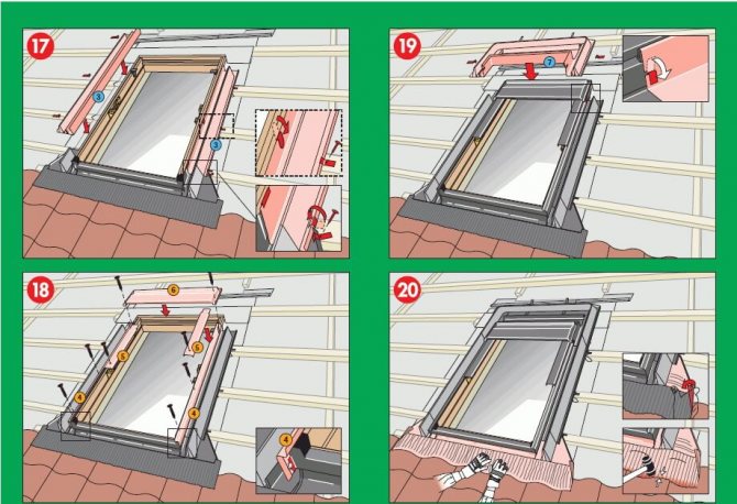 Pour éviter les fuites, un solin de fenêtre est monté - un tablier de protection est fourni dans le kit. Séquence de montage de l'élément d'étanchéité:
