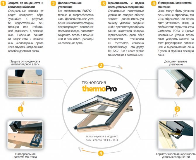 Les fenêtres à double vitrage réalisées avec la technologie «triplex» protégeront les habitants du grenier des éclats de verre accidentellement brisé. Depuis les deux verres sont collés ensemble avec un film spécial qui vous permet de conserver les fragments. Le revêtement Easy Clean sépare la saleté accumulée sur les vitres euro sous l'influence du soleil, ce qui facilite le nettoyage de la vitre.