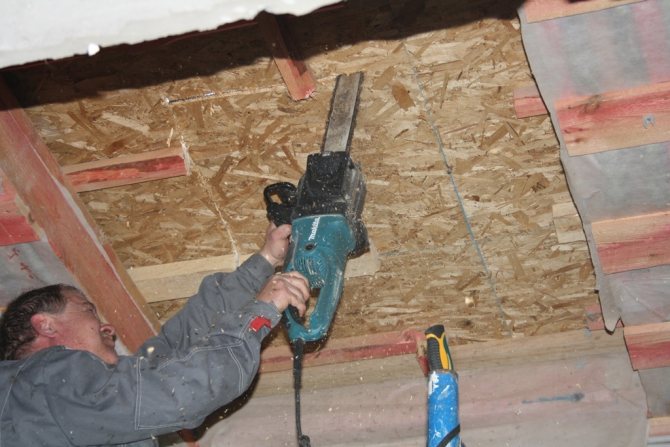 - Retirez le boîtier selon les marquages. Coupez le lattage et la couche d'isolation thermique - la coupe est effectuée parallèlement au sol en haut et verticalement en bas. Cette approche ouvrira un accès sans entrave à la lumière.