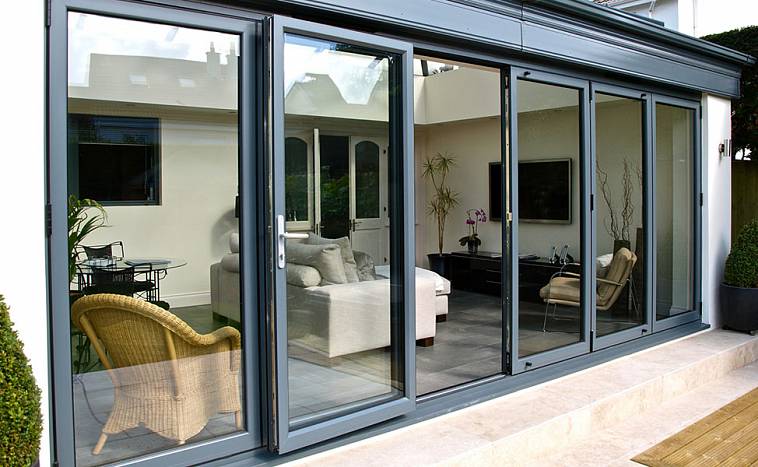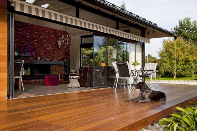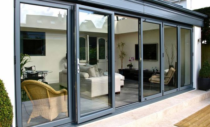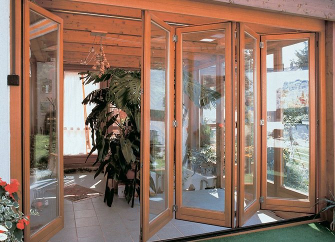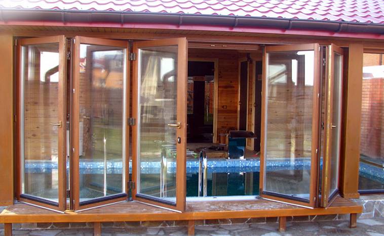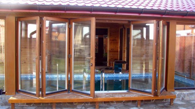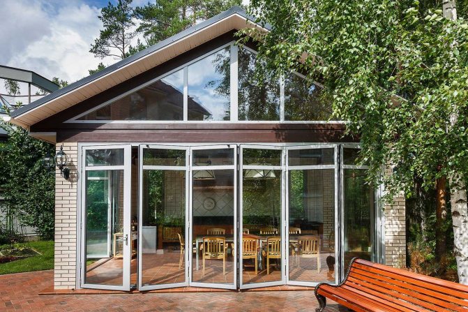 Les portails et autres structures coulissantes ne s'ouvrent pas à plus de la moitié. Et les portes en accordéon vous permettent de supprimer complètement la clôture murale. Une fois repliée, la terrasse se transforme en un espace ouvert. Toute la gamme de couleurs de stratification est disponible pour la finition des profilés PVC.