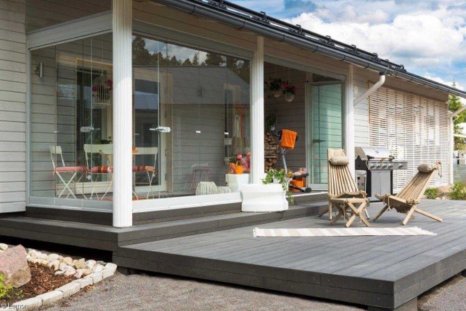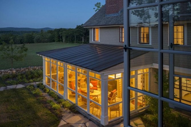 Le vitrage de la véranda nécessitera dans tous les cas un investissement assez important. Cette pièce sera un excellent remplacement pour un gazebo et vous permettra de profiter de l'unité avec la nature par tous les temps. Convenez qu'il est insensé de passer du temps en dehors de la ville, tout en vous limitant à quatre murs. Si la terrasse n'est destinée qu'aux vacances d'été, il vaut la peine d'envisager un vitrage partiel ou d'utiliser du polycarbonate bon marché comme alternative. Si la maison est très petite, alors l'extension vous permettra d'ajouter un autre salon à son espace avec un confort unique et une ambiance chaleureuse.