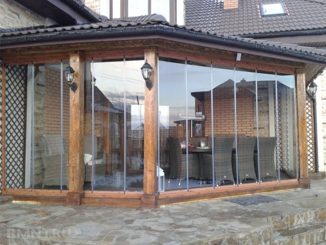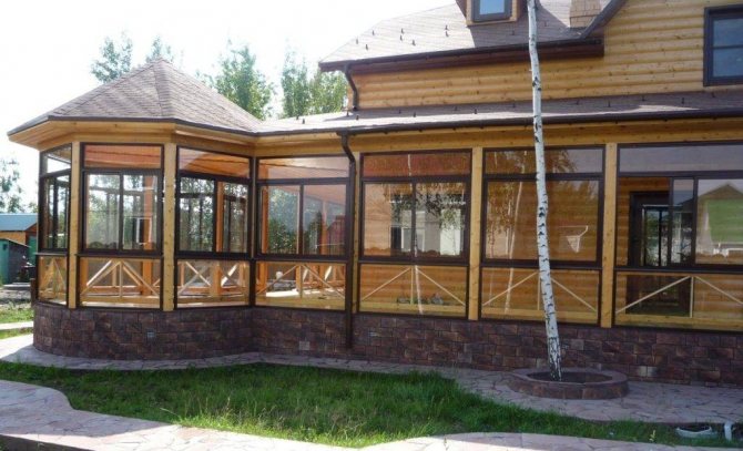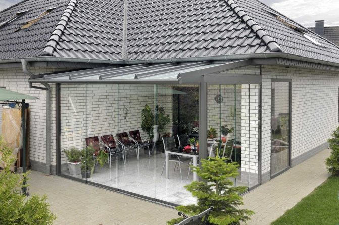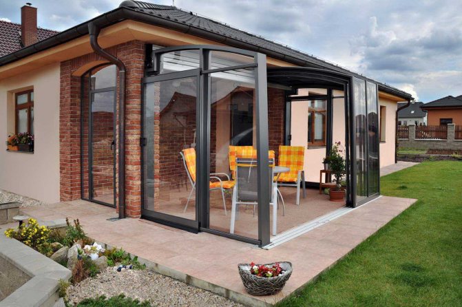 Si nous mentionnons les caractéristiques du vitrage de la véranda, cela devrait aller bien avec le design de la maison. C'est une condition préalable et la plus importante. Ensuite, vous devez faire attention à la zone de la toile translucide afin de lui fournir un support approprié sous forme de cadres et en même temps de ne pas réduire la résistance de toute la structure.