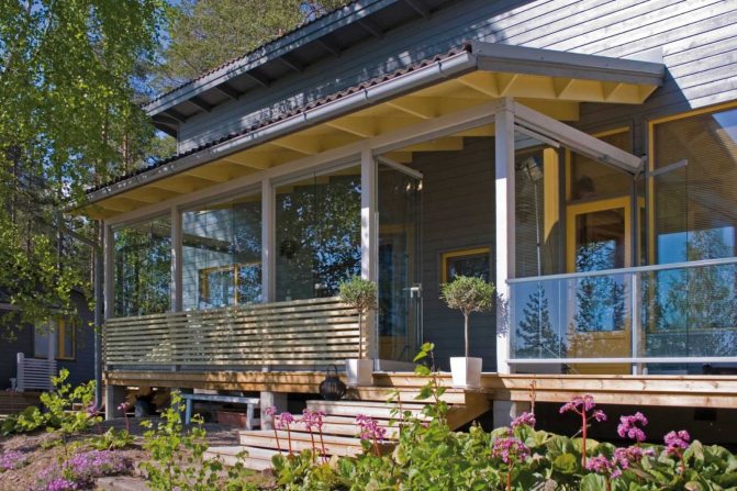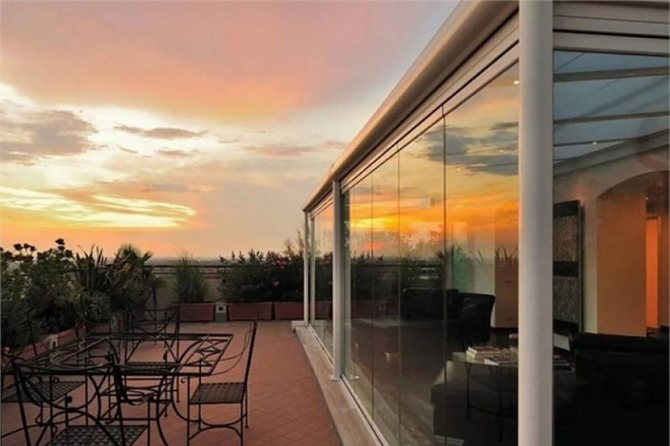Si on le souhaite, une partie du vitrage de la terrasse peut être rendue sourde, ce qui simplifie et réduit le coût de l'ensemble de la structure. Vous pouvez également choisir le type de vitrage: s'il y a des enfants dans la maison, le verre trempé résistant aux chocs ou le triplex est sûr et résistera à un coup de balle accidentel.