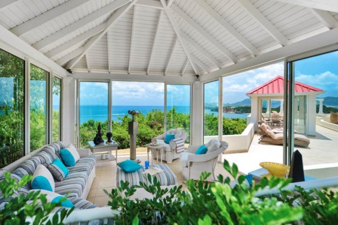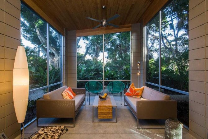 Le design de la véranda est sélectionné pour le design stylistique de la maison. L'intérieur de cette pièce ne doit pas se démarquer de la composition globale. Le plus souvent, les vérandas servent de salons. Ici, ils ont mis un large canapé, des fauteuils, une table basse.