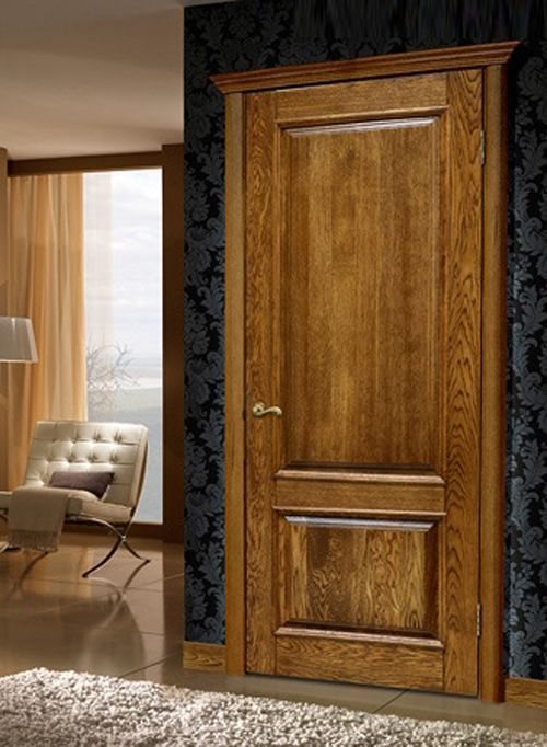- Le bois massif est le matériau le plus cher, mais aussi le plus attrayant. Dans ce cas, le vantail de la porte est constitué d'un panneau en bois massif, il se distingue par une excellente isolation thermique et phonique. Cependant, il a le poids maximum. En moyenne, 1 mètre carré m. massif pèse jusqu'à 20-25 kg. Plus la dureté et la densité du bois sont élevées, plus le produit qui en est fait est lourd. Les plus lourdes sont les portes en chêne. Sur la photo, il y a une porte intérieure en chêne.