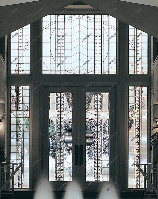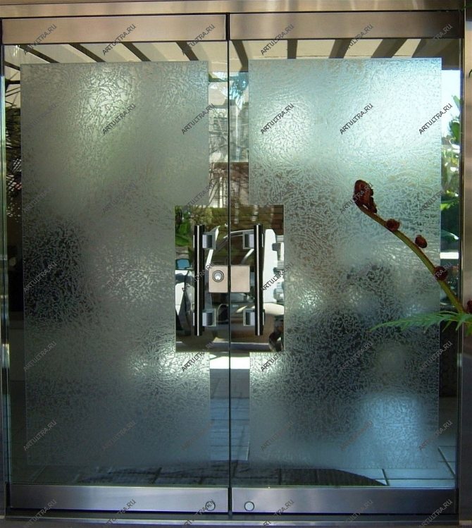 Les verres et autres composants en ce matériau peuvent être décorés avec une machine de sablage, impression photo, sérigraphie, gravure. En ce qui concerne les options coûteuses, l'installation de vitraux classiques est autorisée ici. Les modifications forgées semblent très avantageuses. Ils sont durables, mais nécessitent un entretien sérieux et l'utilisation de matériaux anticorrosion.