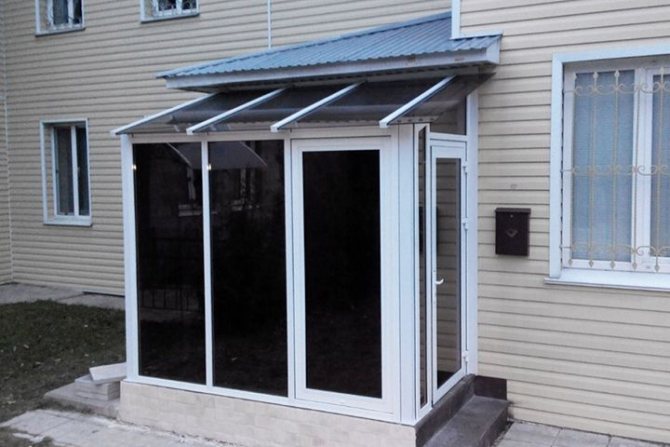 - Avec une porte en métal-plastique. C'est une option simple et abordable. Il n'y a pas de marches ni de porche. La visière est montée sur un support mural et est en polycarbonate.