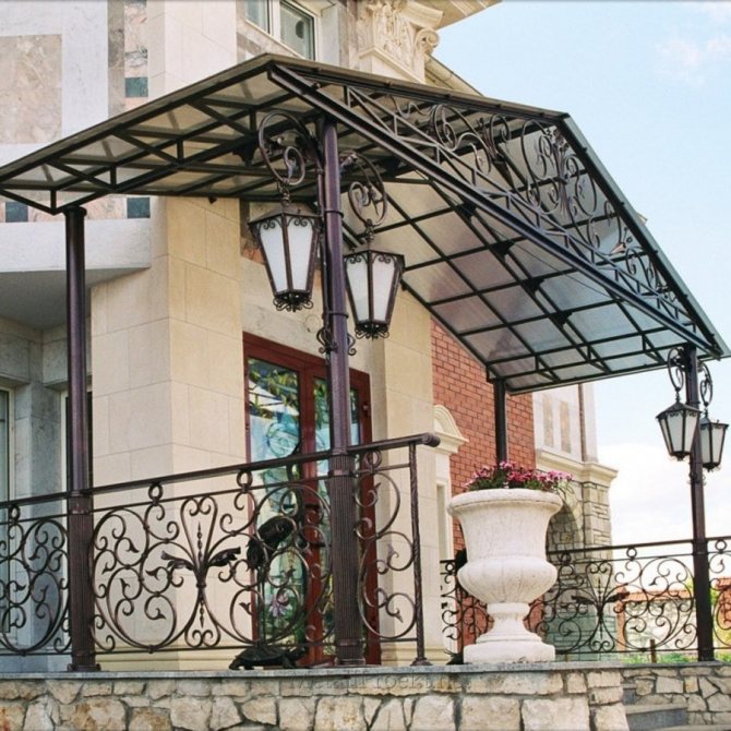 La verrière au-dessus de l'entrée peut être réalisée en plusieurs versions. Il peut être situé directement au-dessus de la porte, ou il peut fermer complètement l'escalier avec des balustrades. Un excellent ajout à la visière est le forgeage ajouré. Lors de la construction d'une maison à deux étages, la visière au-dessus de la porte d'entrée est remplacée par un petit balcon avec une balustrade en fer forgé.