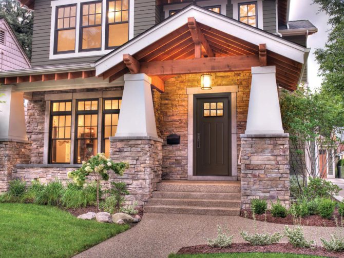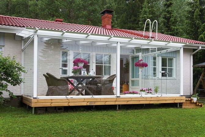 Ce type de conception de l'entrée de la maison est utilisé dans les petites maisons de campagne. Leur construction ne nécessite aucun équipement spécial ni connaissances particulières. Le coût d'une telle structure est faible, ce qui la rend particulièrement populaire.