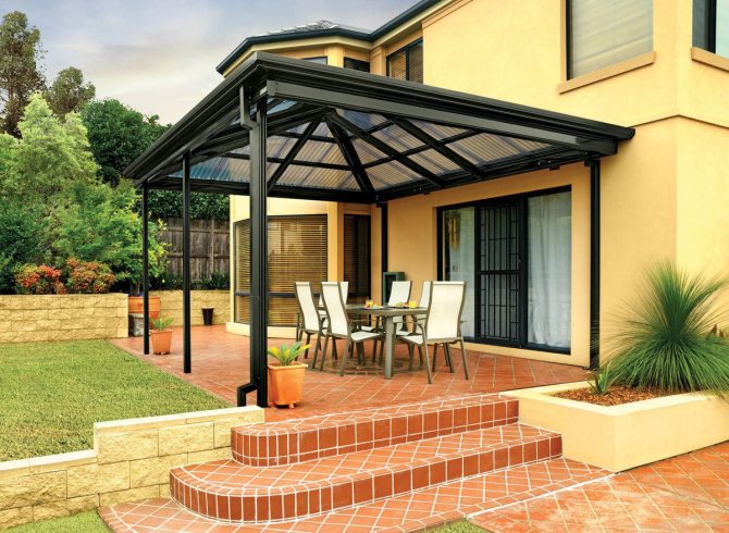 Important! Pour certaines maisons de campagne, il n'est pas pratique de construire des structures coûteuses en métal ou en bois. Dans ce cas, ils recourent à l'utilisation de polycarbonate, en équipant un porche.