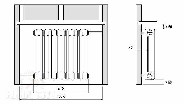 - La distance minimale qui devrait être entre le radiateur et le rebord de la fenêtre est de 8 centimètres. Ainsi, il s'avère que la hauteur moyenne des fenêtres varie de 70 à 90 centimètres, ce qui est tout à fait satisfaisant pour la plupart des propriétaires en construction.