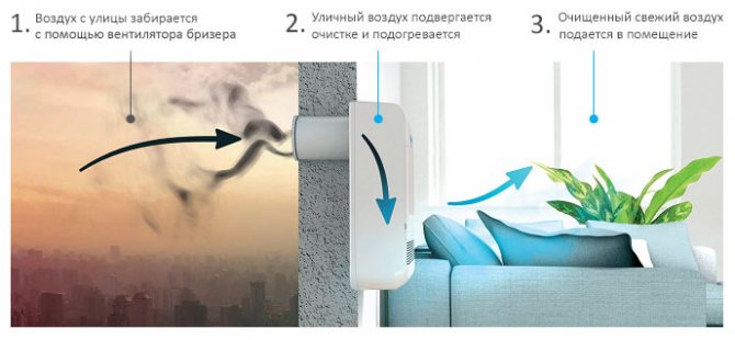 Effet: L'air frais de l'extérieur pénètre dans le balcon par l'ouverture, passe à travers le conduit et, après filtration, pénètre dans la pièce.