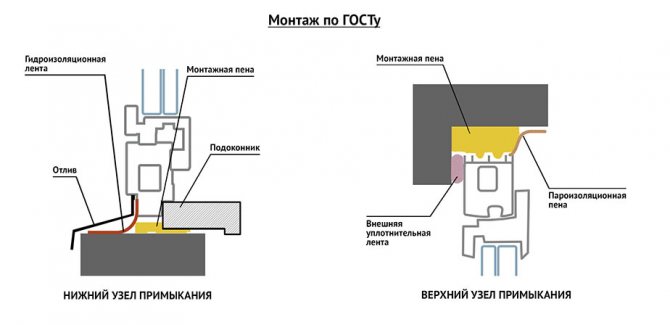 Des exemples de solutions constructives pour les nœuds de jonction des blocs de fenêtres aux ouvertures de mur sont donnés dans l'annexe B GOST 30971-2012 et l'annexe A GOST R 52749-2007 (lors de l'utilisation de PSUL - bandes isolantes auto-expansibles perméables à la vapeur).