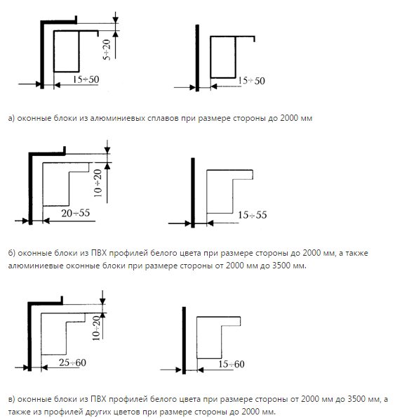 Une attention particulière doit être portée à la distance qui se forme entre le cadre et le bord extérieur du mur, sa taille est supérieure à 120 mm. Vérifiez la taille de la largeur de l'espace formé entre le cadre de la fenêtre et le mur, qui doit être de 2 à 4 cm, et la taille de l'espace doit être de 5 à 20 mm.