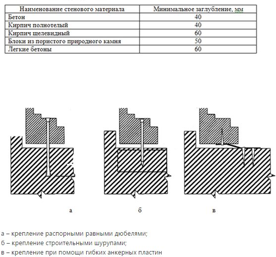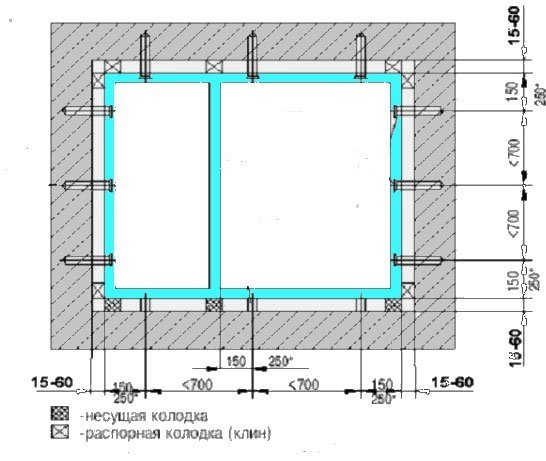 Pour la fixation des cadres, des plaques d'ancrage et des ancrages sont utilisés. A la fin de l'installation, les cales avec joints sont retirées. Après cela, chaque bloc de support est approfondi dans le mur de 1 à 1,5 cm. Le reflux est installé en le fixant au cadre avec des vis ou au mur à l'aide de chevilles.
