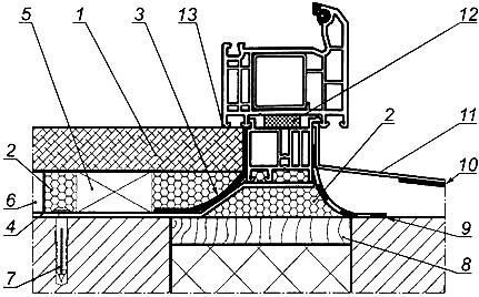 Figure А.4 GOST R 52749-2007 - Nœud de la butée inférieure du bloc de fenêtre, rebord de fenêtre et drain jusqu'à l'ouverture d'un mur en couches avec une isolation efficace. 1 - panneau de fenêtre; 2 - isolation en mousse; 3 - ruban pare-vapeur; 4 - plaque d'ancrage flexible; 5 - bloc de support pour le rebord de la fenêtre; 6 - mortier de plâtre; 7 - cheville avec une vis de verrouillage; 8 - un insert en bois antiseptique ou une couche de nivellement de mortier de plâtre (recommandé uniquement pour l'unité inférieure); 9 - ruban imperméable à l'eau et perméable à la vapeur; 10 - joint absorbant le bruit; 11 - drain; 12 - ruban isolant auto-expansible perméable à la vapeur (PSUL); 13 - une fine couche de scellant