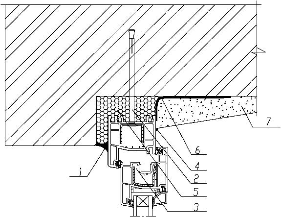 Figure В.2а GOST 30971-2012 - L'unité de la jonction supérieure (latérale) du bloc de fenêtre à l'ouverture avec un quart dans le mur de briques à l'aide d'un scellant perméable à la vapeur avec finition de la pente intérieure avec du mortier de plâtre. 1 - mastic perméable à la vapeur; 2 - cheville de cadre; 3 - bouchon décoratif; 4 - mastic; 5 - isolation en mousse; 6 - scellant pare-vapeur; 7 - mortier de plâtre.