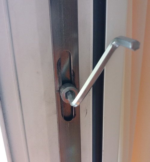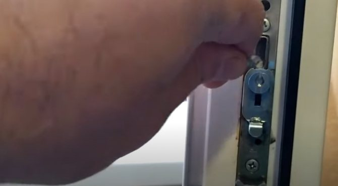 Il y a une autre vis de réglage pour appuyer le coin supérieur de la fenêtre sur le cadre. Pour y accéder, vous devez ouvrir la fenêtre dans deux directions à la fois. Pour ce faire, appuyez sur le verrou à l'extrémité de l'ouvrant, comme indiqué sur l'image.