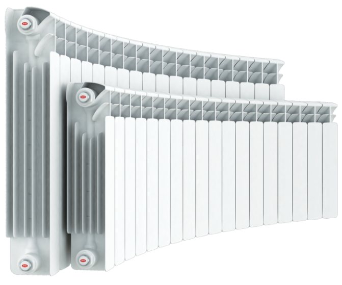 Les radiateurs bimétalliques proposés sont en coupe. Dans les versions standard, le nombre de sections est de 4 à 14 et, à la demande du client, il est possible de les réduire à 2 ou de les augmenter à 24. L'entreprise est spécialisée dans la production de plusieurs modèles d'apparence, de destination et des conditions de fonctionnement. Mais tous les types ont un transfert de chaleur élevé, obtenu par des ailettes spéciales en aluminium à cadre plat, qui augmentent la surface de rayonnement.