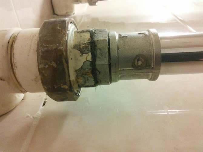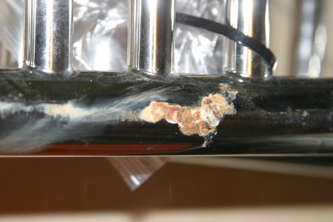 - Violation de l'intégrité du tuyau. Le processus de dégradation du métal s'accélère progressivement, ce qui est presque garanti pour causer de graves problèmes. En conséquence, soit l'intégrité du filetage du sèche-serviettes chauffant est cassée, soit un trou apparaît dans le tuyau sous l'influence de la pression.