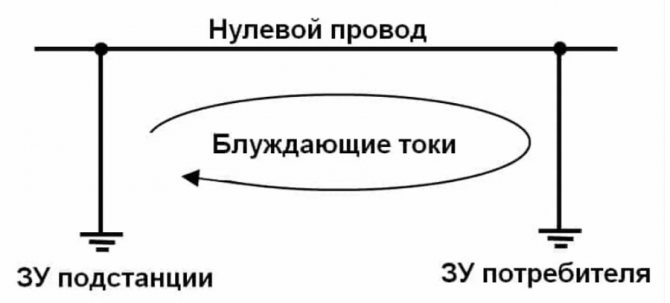 Le fil neutre (PEN) est connecté à une extrémité au dispositif de stockage de la sous-station électrique, et à l'autre extrémité, il est connecté au bus PEN du consommateur, qui est connecté au dispositif de mise à la terre de l'installation. En conséquence, la différence de potentiels électriques entre les bornes du conducteur neutre sera transférée au chargeur, ce qui créera des conditions pour la formation d'un circuit. La quantité de fuite sera négligeable, car la charge principale suivra le chemin de moindre résistance (conducteur neutre), mais, néanmoins, une partie passera le long du sol.