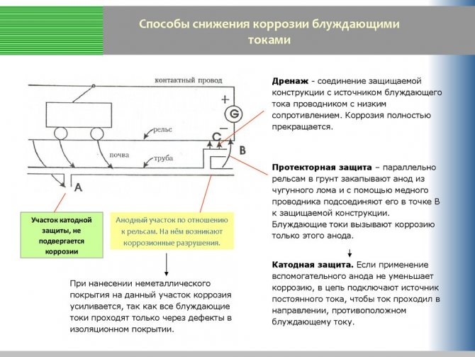 Sous l'influence des courants vagabonds, le processus de corrosion électrochimique se produit. Son intensité dépend de la composition du sol, du degré de prélèvement d'eau et des caractéristiques de la nappe phréatique. La destruction du métal se produit en raison de la différence des potentiels redox inhérents à l'acier et au sol environnant.