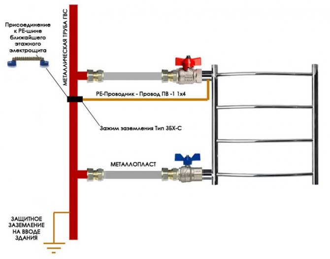 - Mise à la terre du sèche-serviettes. Pour ce faire, il est nécessaire de connecter les tuyaux du sécheur à la colonne montante à l'aide d'un conducteur en cuivre d'une section d'au moins 4 mm2. D'autres objets métalliques capables de conduire l'électricité accumulée sont également mis à la terre.