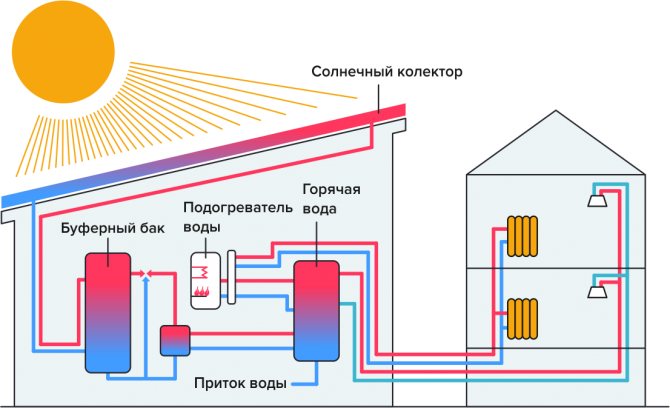 Le système solaire est complexe d'appareils utilisés pour recevoir l'énergie thermique du soleil pour le chauffage domestique ou à d'autres fins. C'est une source de chaleur pour le fluide caloporteur du circuit de chauffage de la maison. Le chauffage se fait directement ou indirectement par l'intermédiaire d'un échangeur de chaleur.