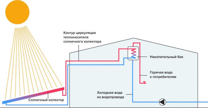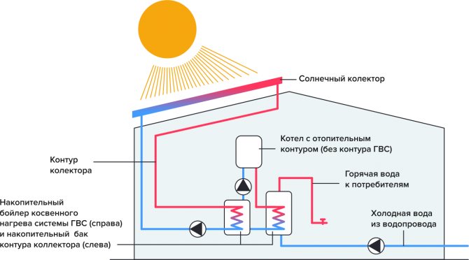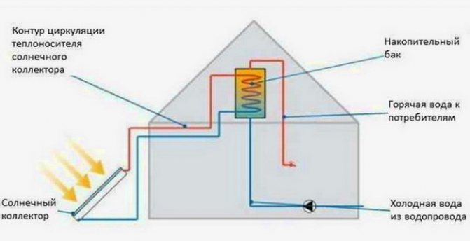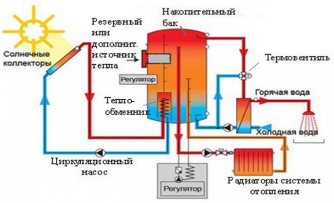 Les systèmes à double circuit sont plus complexes... Le liquide de refroidissement qui se réchauffe dans le collecteur est dirigé vers un serpentin installé à l'intérieur du réservoir de stockage et dégage de l'énergie thermique, après quoi il pénètre à nouveau dans le collecteur. L'eau chauffée du réservoir est acheminée vers les points d'analyse (baignoires, éviers et autres appareils sanitaires), et est également dirigée vers le circuit de chauffage. En se refroidissant, il pénètre à nouveau dans le réservoir, où il est chauffé à partir du serpentin. Habituellement, l'antigel circule à l'intérieur de la ligne collectrice, car les fluides ne se mélangent pas, c'est-à-dire. le chauffage de l'eau se fait de manière indirecte.