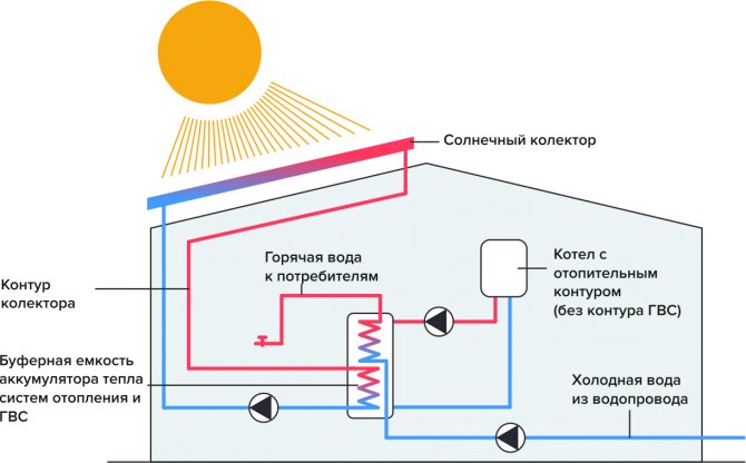 Une chaudière spéciale avec deux échangeurs de chaleur est utilisée ici. Si au lieu d'une chaudière il y a un accumulateur de chaleur, alors nous obtenons un système de chauffage avec support d'énergie solaire. Une telle astuce ne sera pas bon marché, mais elle sera payante avec le temps. Après tout, vous économiserez du carburant pour la chaudière. Personnellement, je pense qu'une telle solution a le droit d'exister.