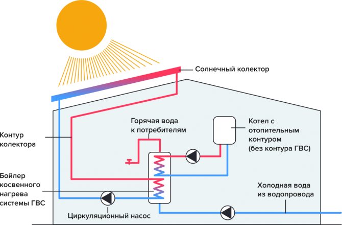 Contrairement aux capteurs à thermosiphon, les capteurs plats peuvent également être utilisés pendant la saison froide. Pour ce faire, un antigel spécial pour le chauffage doit circuler à l'intérieur de celles-ci. Dans ce cas, les appareils sont connectés à une chaudière à chauffage indirect. Cela ressemble à ceci :