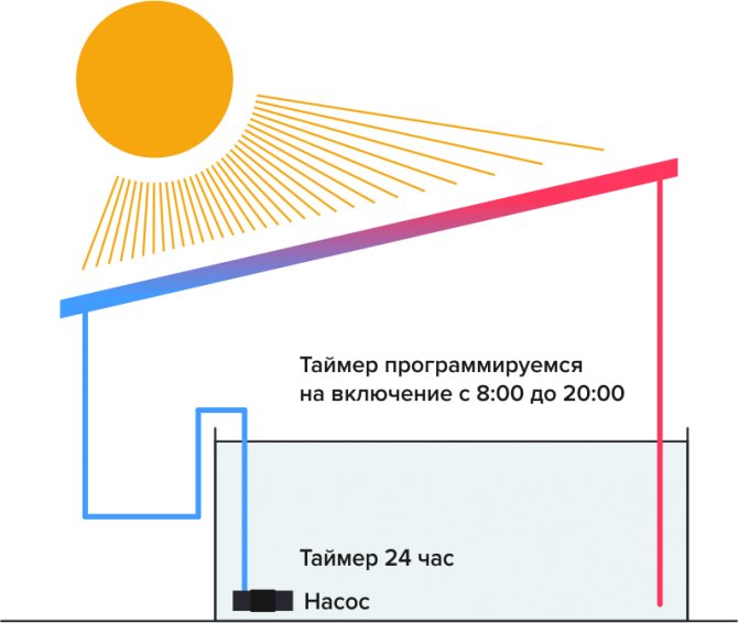 Circulation naturelle. Le principe de soulever les liquides chauffés vers le haut est utilisé. Pour assurer un mouvement stable, le capteur doit être situé sous le ballon de stockage et le circuit de chauffage doit être situé de manière à ce que l'eau chaude monte et pénètre dans le système de chauffage et que le retour refroidi retourne au capteur pour le chauffage.