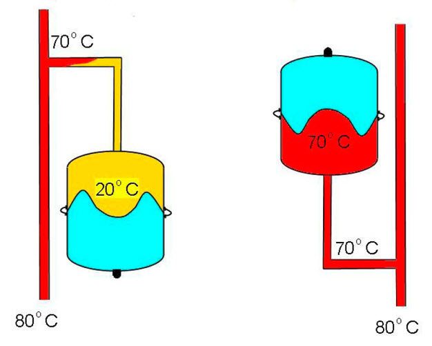 Lors de l'installation du réservoir, tenez compte de sa position. Si la connexion se fait par le bas et que le réservoir lui-même est situé au-dessus du groupe de pompage, la membrane sera alors exposée à des températures élevées. Aussi, avec une telle installation, une bulle d'air peut se former sur la membrane. Cette bulle assèchera le caoutchouc et entraînera une détérioration des propriétés élastiques. En conséquence, la membrane peut éclater beaucoup plus tôt que prévu.