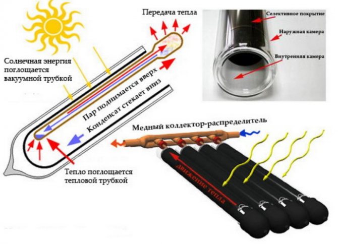 Il existe également des types de collectionneurs plus modernes dans lesquels le principe d'une pompe à chaleur est utilisé - un liquide volatil est dans un récipient scellé. Lorsqu'il est chauffé par la chaleur du soleil, il s'évapore.Cette vapeur monte dans la chambre de condensation et se dépose sur les parois, tout en libérant beaucoup d'énergie thermique. Une chemise d'eau est créée de l'autre côté des murs, qui reçoit cette chaleur et est envoyée au système de chauffage.