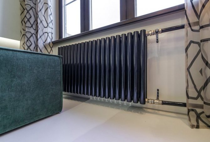 - Coloration du pipeline principal en noir ou d'une autre couleur sombre. Cette méthode, malgré toute sa simplicité, est assez efficace. En outre, la palette de couleurs peut s'intégrer de manière tout à fait organique dans la conception moderne des locaux, contrairement au passé récent, alors qu'elle était considérée comme une mesure nécessaire.