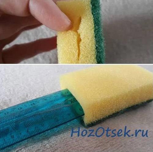 - L'éponge en mousse peut être coupée en deux de sorte qu'un trou soit formé à l'intérieur, et une règle ou toute latte large peut être insérée dans la coupe résultante.