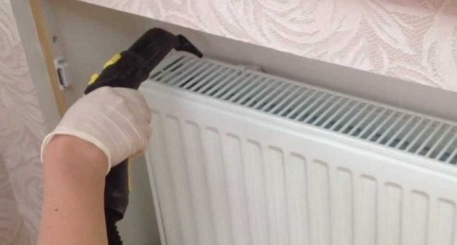 - Le générateur de vapeur aidera à laver les batteries "accordéon". Si vous possédez un tel appareil, allumez-le et dirigez un jet de vapeur chaude vers le radiateur. L'exposition thermique dissoudra même la vieille saleté et désinfectera en outre les batteries, ce qui est parfois nécessaire.Pour protéger toutes les surfaces environnantes, couvrez-les avec une toile cirée ou un vieux chiffon. Et rappelez-vous que la vapeur chaude peut endommager la finition, surtout si la peinture a été appliquée pendant une longue période et en une seule couche.