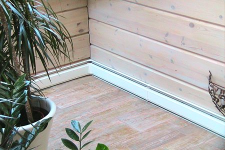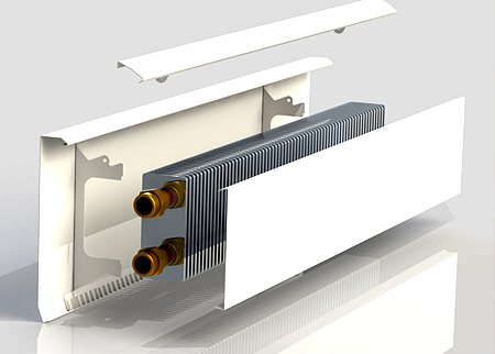 Type d'eau se compose de pièces telles qu'un bloc radiateur, un collecteur et des tuyaux en plastique. Le principe de fonctionnement est basé sur la loi de la physique concernant l'attraction du flux d'air vers les surfaces voisines. L'air est chauffé par un radiateur plinthe par convection. Il pénètre dans la fente de la partie inférieure de la plinthe, se réchauffe et sort par la fente supérieure en remontant le long du mur. Ainsi, quelque temps après avoir allumé le chauffage, vous obtiendrez des murs chauffés, qui eux-mêmes diffuseront de la chaleur dans la pièce.