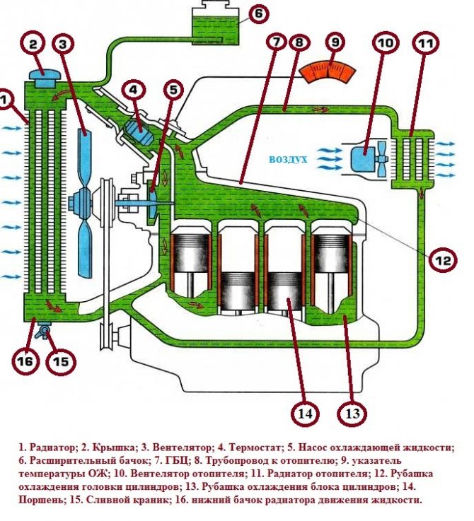 Afin de stabiliser la température, tous les moteurs à combustion interne dans leur conception ont une chemise de refroidissement à travers laquelle le fluide circule à l'aide d'une pompe. L'antigel chauffé est acheminé par l'autoroute jusqu'au radiateur de la voiture. Dans celui-ci, le liquide est refroidi, puis retourne vers le moteur. Ce processus vous permet de maintenir la température de fonctionnement du moteur à combustion interne.