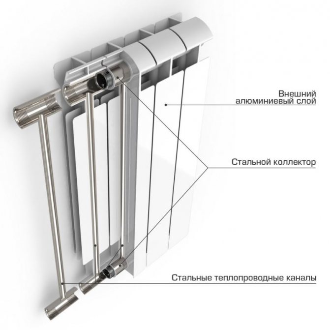 Chaque section a un design simple et ils sont reliés les uns aux autres par un système de tétines. Un mamelon est un joint qui a des fils des deux côtés. À l'aide de celui-ci, les sections forment les collecteurs supérieur et inférieur, formant des canaux horizontaux. Un liquide de refroidissement circule à travers eux, dégageant sa chaleur. Le canal inférieur a des enveloppes dans lesquelles des débris, des particules de métaux lourds et d'autres grosses impuretés sont invariablement présents dans l'eau chaude circulant dans les tuyaux.
