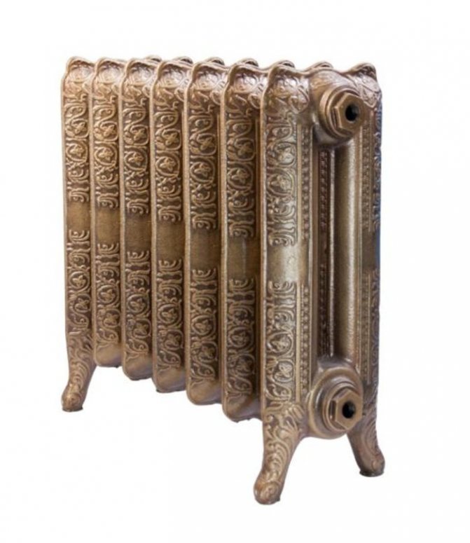 - Les appareils en fonte sont assemblés à partir de sections. Ils sont fournis avec un large canal pour le liquide de refroidissement, ils ont une structure fiable. Les designs modernes sont légers et ne pèsent que 3 à 4 kg. Ils produisent des designs classiques, élégants et artistiques.
