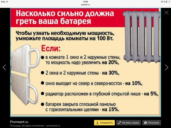 - l'écran, qui recouvre les radiateurs pour la beauté, "vole" 15% de leur transfert thermique, ce qui doit également être pris en compte lors du calcul.
