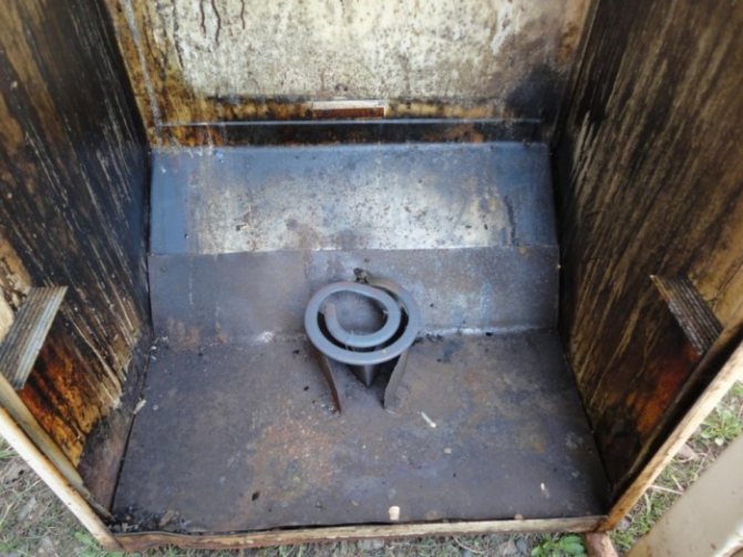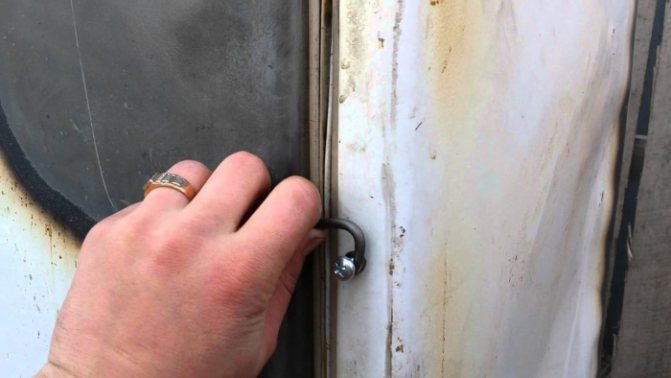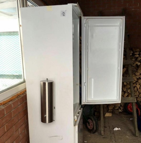 - Préparation du corps du réfrigérateur. Les dispositifs techniques (compresseur, système de refroidissement, composants électriques) ainsi que la base en plastique sont retirés. Les trous formés lors du retrait des appareils sont fermés (les bouchons sont en bois ou en tôle, ruban adhésif, etc.). Dans la partie supérieure du corps, un trou est percé pour la sortie des fumées, et sur les parois latérales, des éléments de fixation des grilles et des crochets sont montés sur lesquels les produits seront placés.