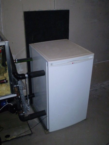 Ensuite, un réfrigérateur préparé est installé. Pour faire un fumoir, une base est faite au point où la cheminée sort à la surface de la terre, sur laquelle le réfrigérateur est installé.