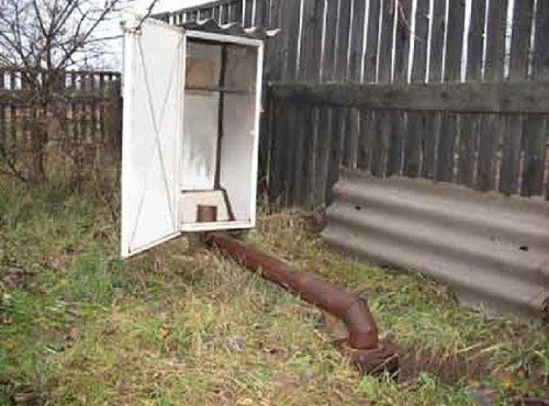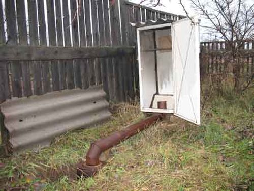 - Sans l'utilisation d'une cuisinière électrique. Dans ce cas, un passage est fait au bas du réfrigérateur pour un tuyau - 10 cm de diamètre et au moins 2 m de longueur. Pour une bonne traction, le tuyau doit être installé en pente. Le tuyau est enterré dans une tranchée pré-creusée. Une extrémité doit être amenée au réfrigérateur, l'autre à la fosse avec le futur feu.