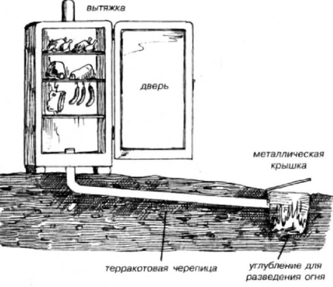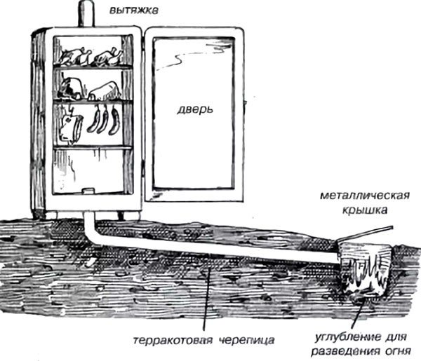 Le tuyau doit être posé dans le sol. Cela réduira davantage la température de la fumée. L'extrémité opposée du tuyau à poser doit être située dans la chambre de combustion située dans la fosse sous le niveau du réfrigérateur. La fosse doit être aménagée en briques réfractaires.