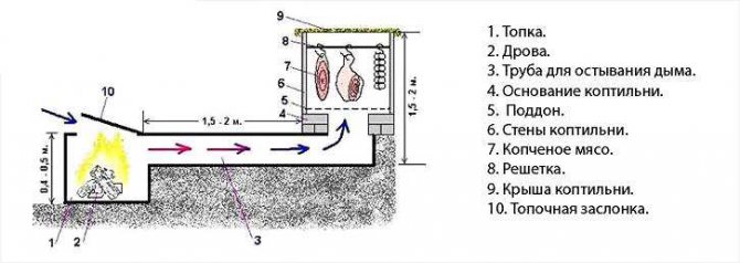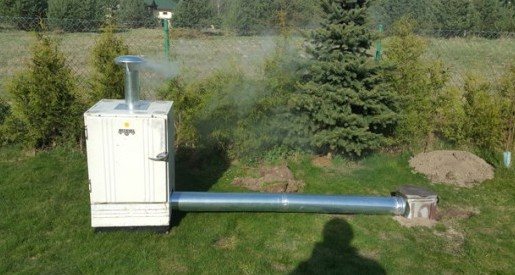 Après avoir installé l'unité de fumage, ils creusent une rainure vers la future chambre de combustion. Le réservoir de combustion est enterré dans le sol, un tuyau est posé le long de la rainure qui lui est reliée au fumoir. Au-dessus de la cheminée, il devrait y avoir une couche de sol de 15 à 20 cm pour le refroidissement naturel de la fumée.